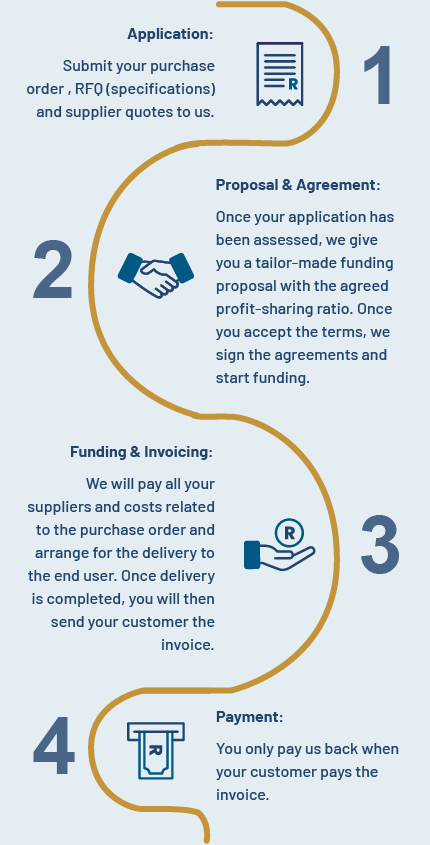 - Step 3: Funding & Invoicing - We will pay all your suppliers and costs related to the purchase order and arrange for the delivery to the end user. Once delivery is completed, you will then send your customer the invoice.